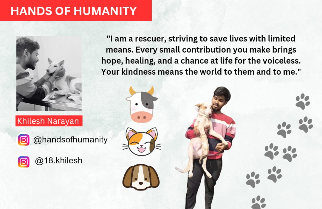 My name is Khilesh, an individual rescuer dedicated to saving animals since my teenage years. I began my rescue journey in Raipur, my hometown, and have continued my efforts after moving to Bhilai. Rescuing animals has always been my passion, but managing expenses for food, medical care, and medicine refills has become challenging. To ensure I can continue helping animals in need, I am raising funds to support these efforts. Your support will make a significant difference in the lives of these voiceless beings and help me keep my rescue work going.